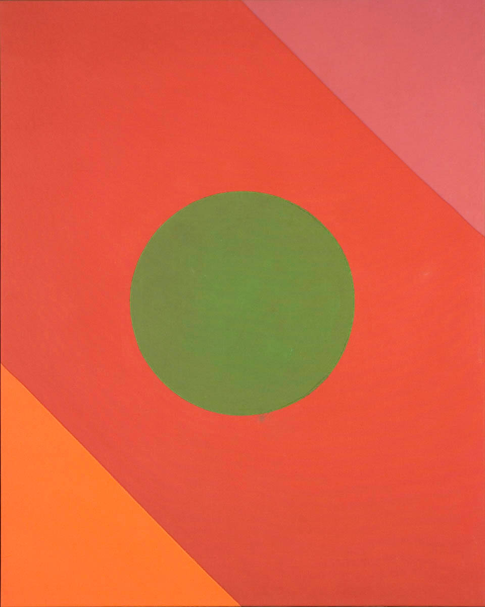 DescriptionRed background; purple triangle upper right hand corner; orange triangle lower left hand corner; green circle in center.Copyright© Paul and Esther Reed Trust