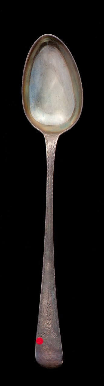 DescriptionBright cut engraved medallion on handle and engraving along edge. Marks on back of stem: HB, lion passant, leopard's head crowned, date n, George III.