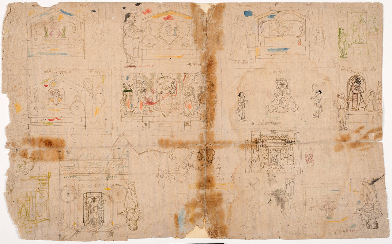 DescriptionPage of sketches showing Shri Nathji, a Krishna image, and other images sacred to the sect in propert attire for different festivals. Inscriptions in Rajasthani identify many of them. Page also includes a sketch of Shri Gosainji, son of the founder of the sect and a partial profile of a Rajput which is placed horizontally on the page.