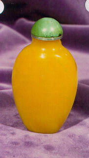 DescriptionBulbous oval-shaped Imperial Yellow Peking glass bottle, metal collar, turquoise stopper.
