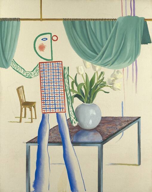 Gallery LabelInvented Man Revealing Still Life expresses the playful dualities-abstraction and realism, flatness and depth-- that characterize much of David Hockney's art. His imaginary man, composed of the abstract forms of a blocky torso and stick-like legs, raises a curtain to reveal a relatively realistic vase of flowers. Hockney overturns the laws of perspective by placing the two-dimensional, flat figure in front of a three-dimensional table that seems to recede toward an imaginary vanishing point. On closer inspection, the back horizontal edge of the table is wider than the front, contradicting the spatial illusion. In Invented Man Revealing Still Life, Hockney's playful manipulation of space and form confirm his commitment to the idea that art should be pleasurable and accessible to everyone.