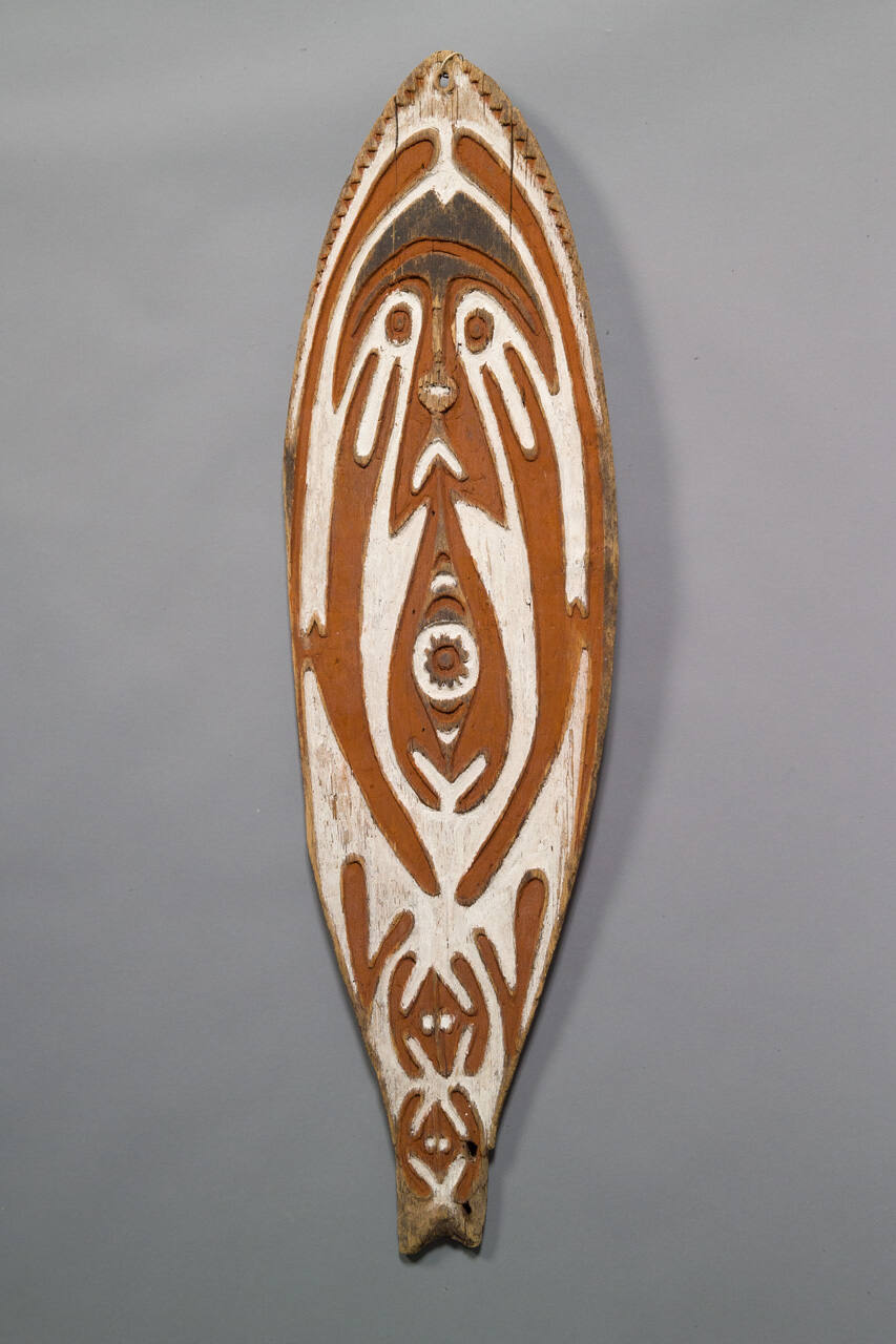 DescriptionOvoid shieldlike form tapering toward bottom. Notch at bottom of board. Angular scallpp decoration to raised edge at top of board. Application o fred and white pigment in recessed areas.