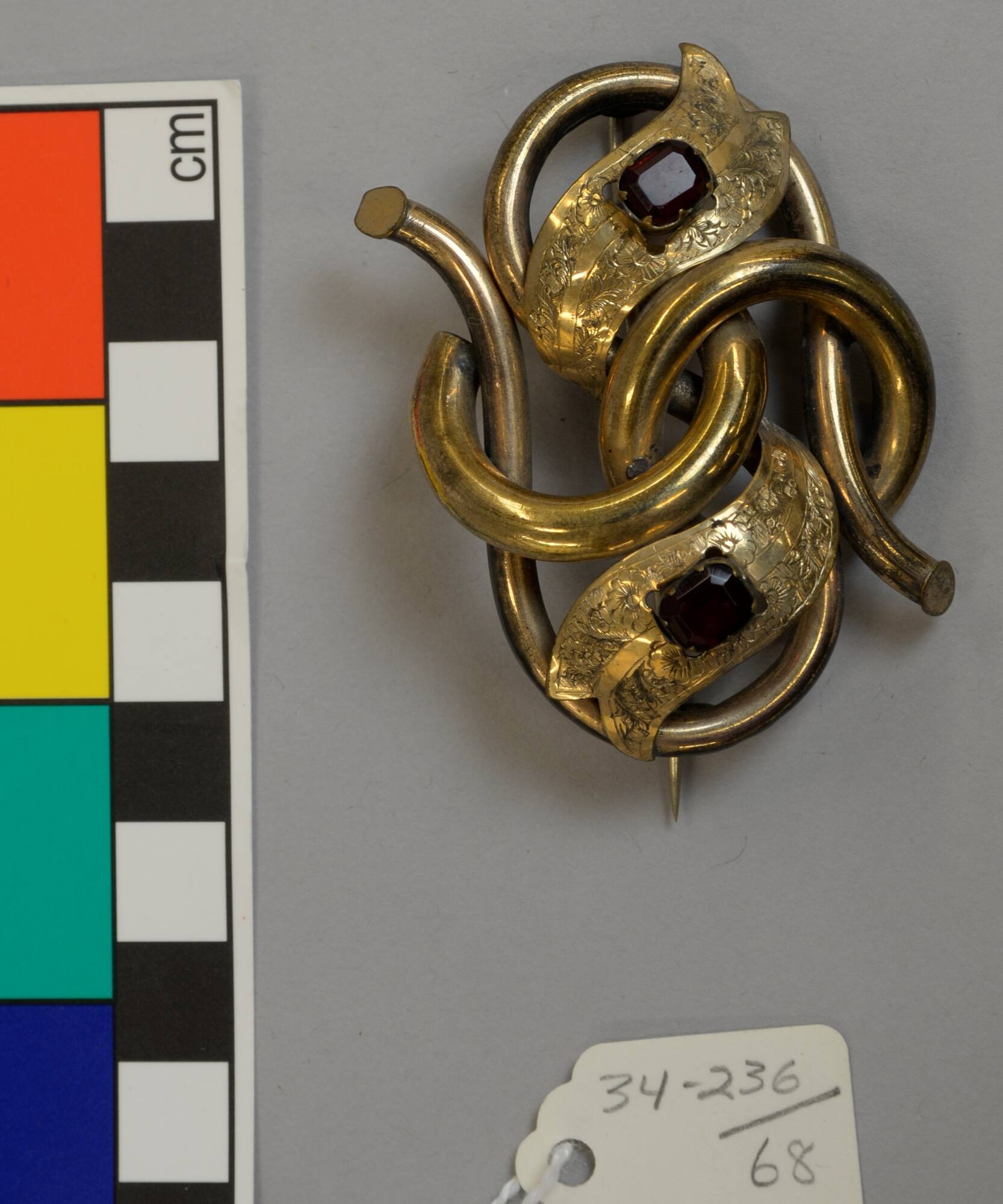 DescriptionPlain gold brooch set with two large rubies.ProvenanceElla Anna Loose (née Clark, 1860-1945), Kansas City, MO, and Washington, DC, by 1934 [1];
