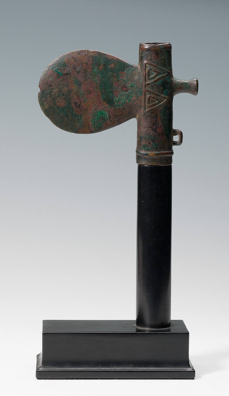 DescriptionAx head in the form of a paddle, decorated with double triangles; encrusted with a smooth green and reddish-brown patina.