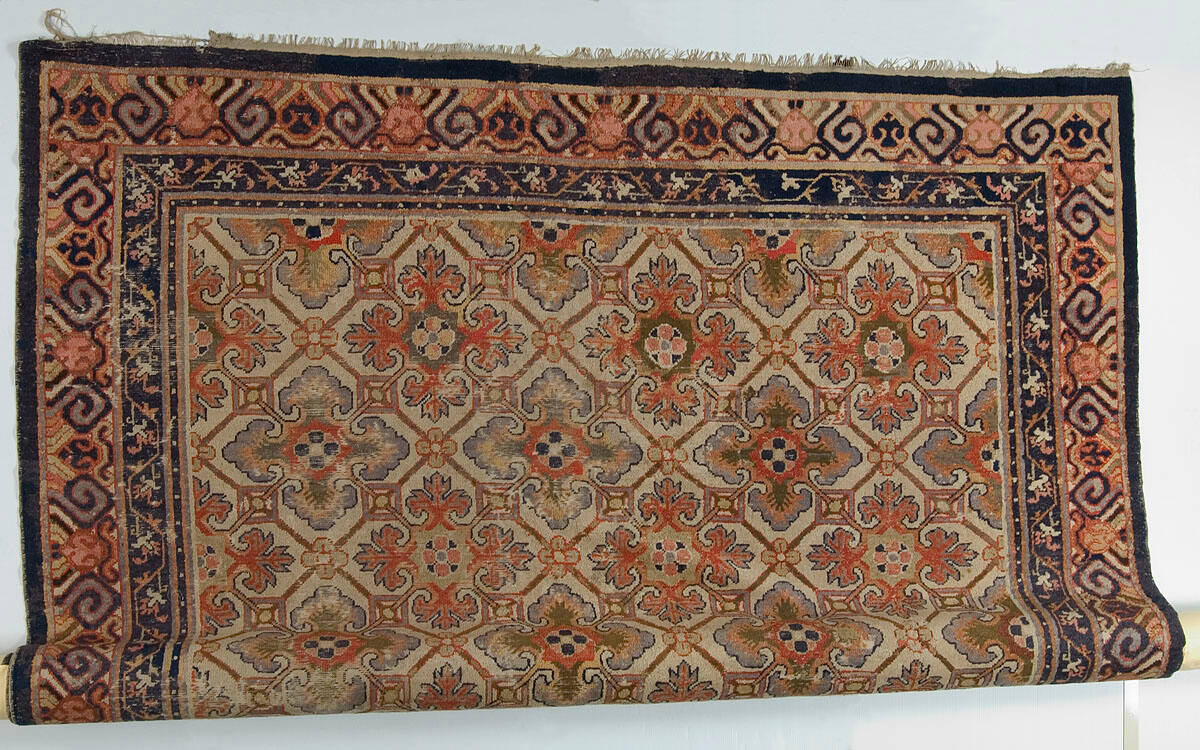 DescriptionGrey-yellow background in center with tile-like design on the diagonal in reds, greens, grey, and black. Dark blue border.