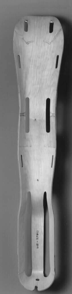 DescriptionMolded plywood leg splint tapering from wide, rounded surface to basket designed to hold foot. periodically by oval-shaped holes.Copyright© Eames Office