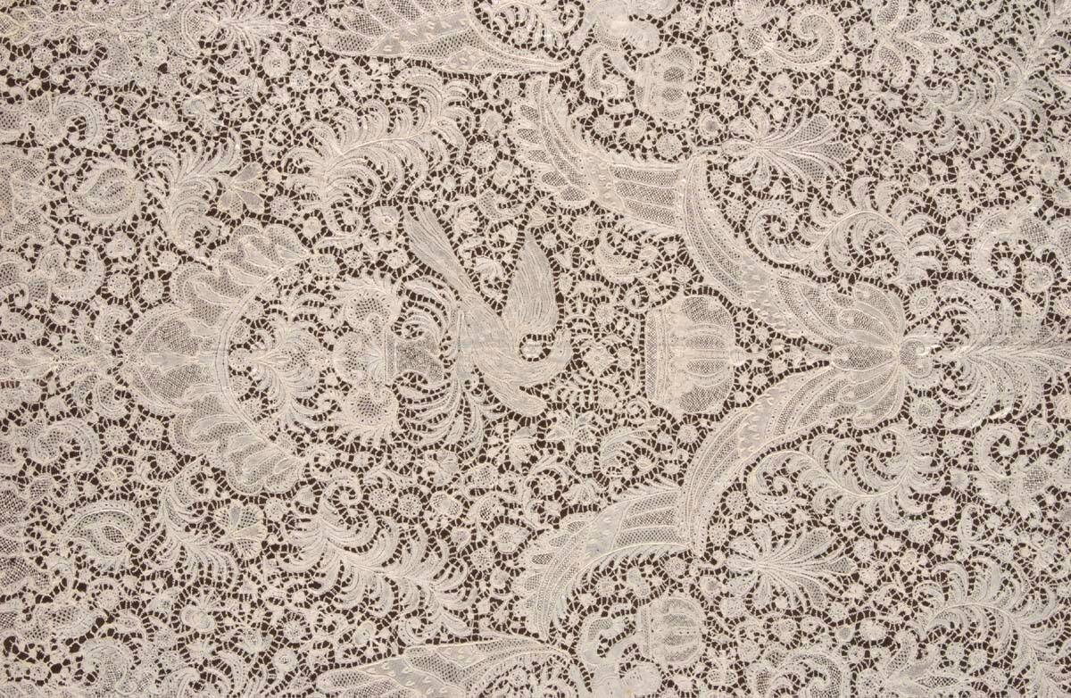 DescriptionBobbin-made part lace of the Brussels type (i.e. made in separate pieces and hooked or sewn together). High quality lace worked in whole and half stitch with raised "veins", a variety of decorative fillings and an irregular ground of pico-decorated bars. Attached to the original upper finished edge is a narrow bobbin-made heading. Repeating design of large, vertical motifs composed of feather-topped [illeg.] with draped curtains enclosing an imperial crown above a large eagle holding a bird in its claws. The curtains are held back by a pair of winged cherubs holding imperial crowns. The chain and lamb of the Order of the Golden Fleece and the initials "AC" or CA" are between main motifs.