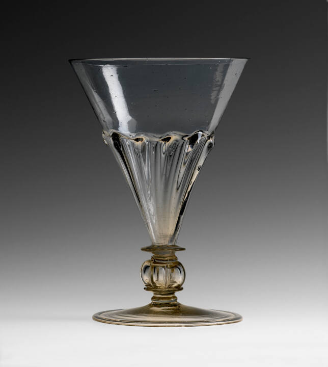 DescriptionDrinking glass of "Anglo-Venetian" style; gadroon-molded conical bowl over wafer and hollow quatrefoil knopped stem; circular folded foot.Published References"Recent Important Acquisitions Made by Public and Private Collections in the United States and Abroad." Journal of Glass Studies, 40 (1998): 141-179 (ill., p. 146, fig. 23).