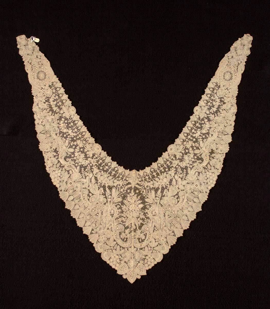 DescriptionNeedle lace of the point de gaze type: fine gauze mesh ground, shaded flower heads ornamented with raised "rings" and a variety of fillings.