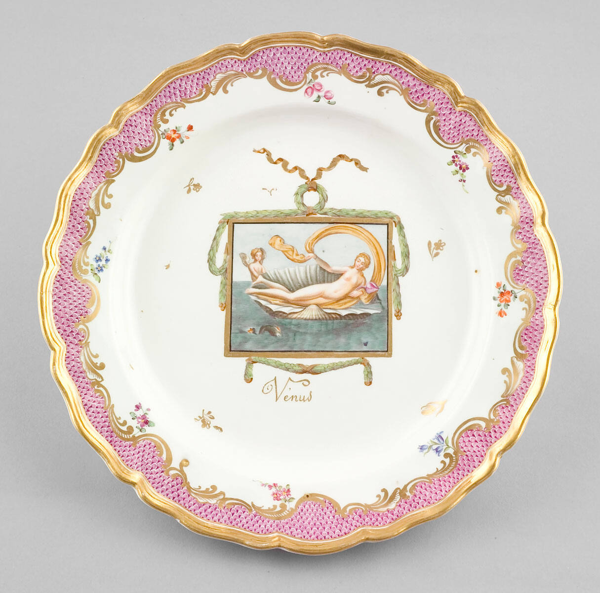 DescriptionPlate with a central, rectangular panel of Venus on the half shell surrouneded by laurel garlands, the molded rim with a pink scalework border outlined in gilt scrolls and floral sprigs.Exhibition History