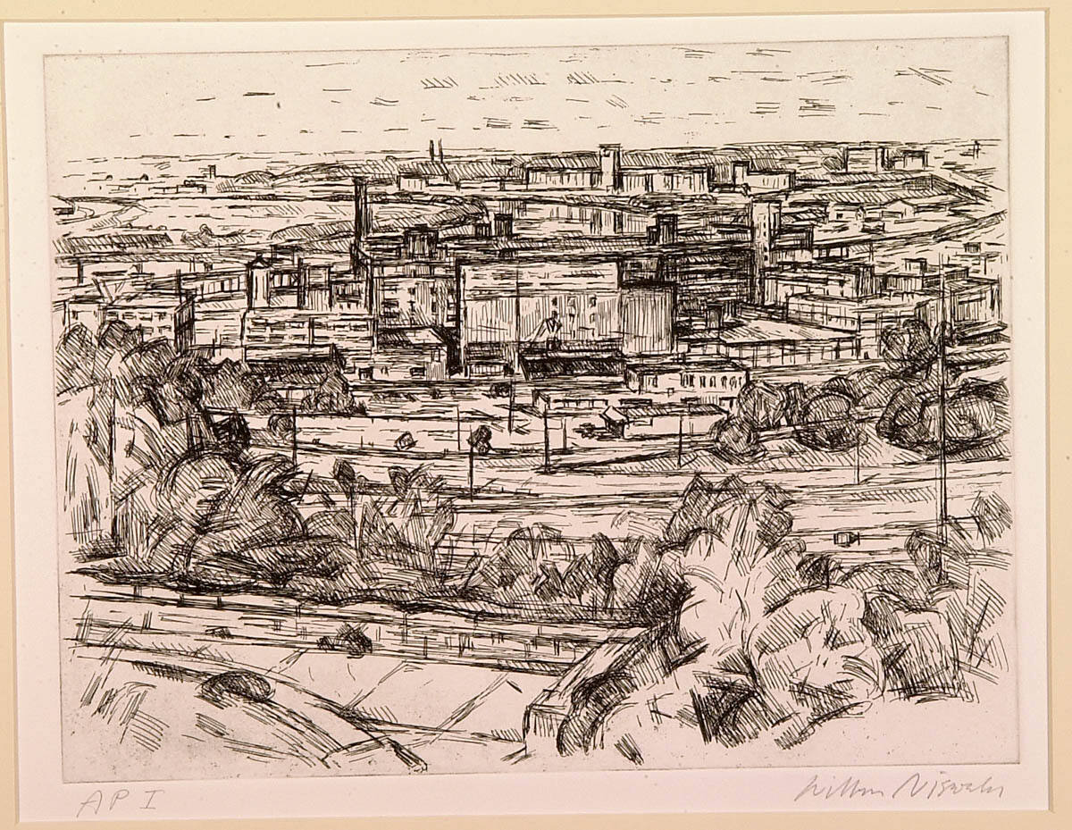 Gallery LabelWilbur Niewald's name is synonymous with both Kansas City and cityscapes, such as this far-off view of the West Bottoms from the historic Quality Hill neighborhood west of downtown. Niewald explained that one of the reasons he was attracted to distant vistas is because that perspective enabled him "to avoid dealing with incidentals."