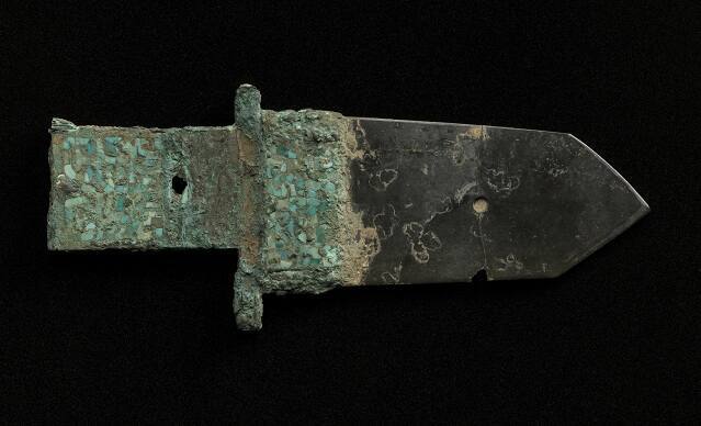 DescriptionShort black jade blade; handle of bronze inlaid with turquoise. Encrusted green patina. Blade broken and point re-cut.ProvenanceT'ang Hsiao Wu, Peiping (modern-day Beijing), China, by April 30, 1934;