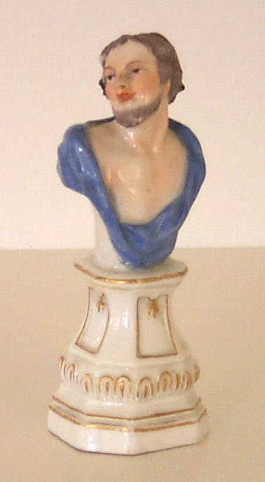 MarkingsRed wheel mark on bottom. Bust of man, bare-chested with blue shawl draped around shoulders. Bearded, with small sprigs of grapes in hair and back. He is smiling. On white with gold trim pedestal. One of a series of "The Four Seasons", this one representing "The Fall".
