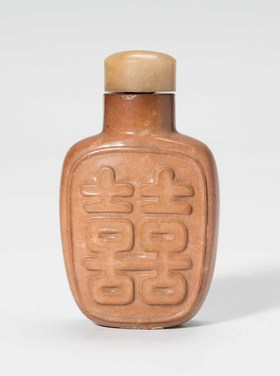 DescriptionFlattened rectangular gray and brown bottle carved in high relief with a panel of double happiness symbols on both sides; green Fei Ts'ui jade stopper.