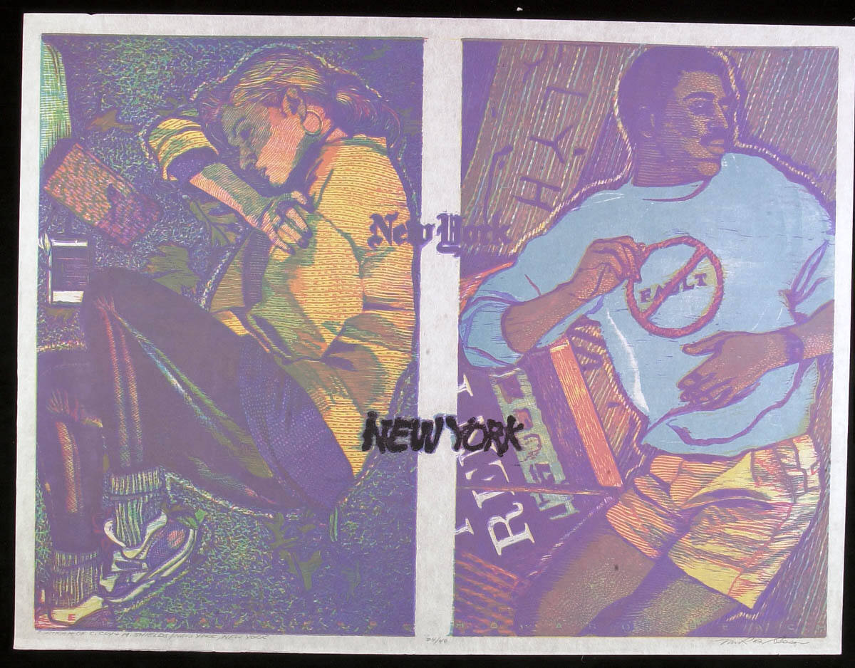 DescriptionTwo separate images of two people lying on the ground. The woman is curled up and the man lies partially on his back. In the middle of both images is text reading "New York" written twice in different styles.Copyright© Mark D. Sisson