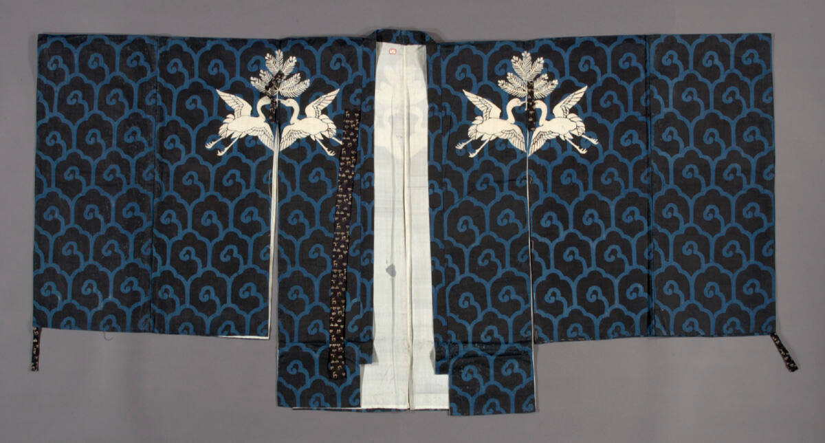 DescriptionIndigo-dyed bast fiber (asa) with stencil dyeing, white silk lining, and bast fiber strips. Suo with paired crane and pine designs in unddyed white on indigo ground, with repeating stylized patterns of waves.