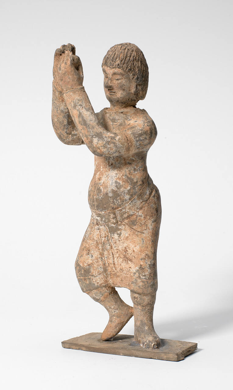 DescriptionDancing male figure with hands above head. Wears long-waisted robe. Has straight hair in "page boy" haircut.