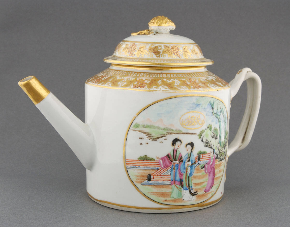 DescriptionPart of seventy-seven piece tea service. In plates and on sides of vessels and containers is scene in famille-rose style with gold monogram, MTA, above figs. Border design of gold grape bunches and leaves in plates and on lids and upper sides of vessels. Lid knobs of jam dish and pots, gold berries. Handles of truncated conical pots and cylindrical sugar, entertwining "vines" ends of which attached with gold leaves.