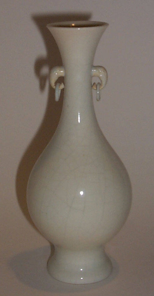 DescriptionSoft-paste, bottle-shaped vase with a wide mouth, decorated with two elephant head handles with loose rings, coated with a creamy white crackle ware. With a wooden stand.