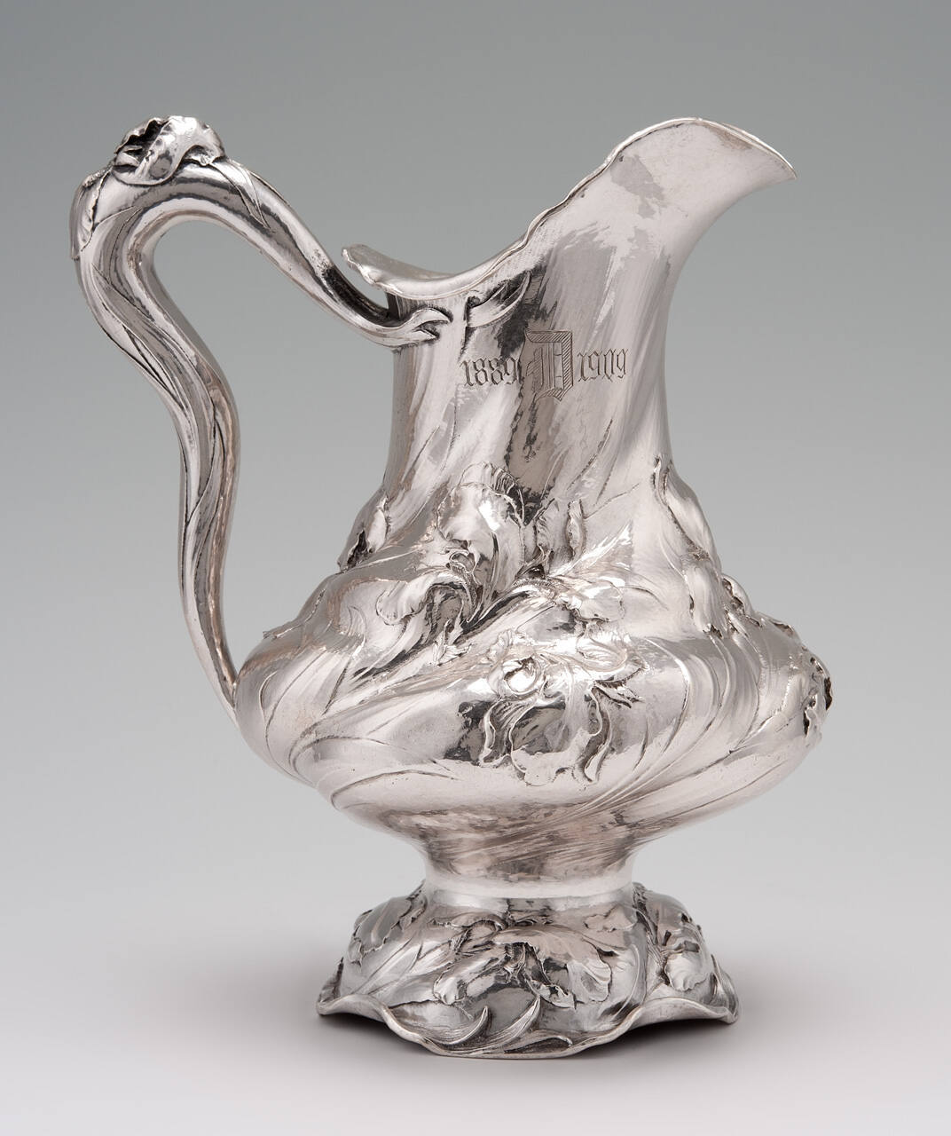 DescriptionPitcher-shaped creamer with all-over repousse design of irises and sweeping foliage. Curved and undulating rim and foot; iris caps handle covered with leaves.