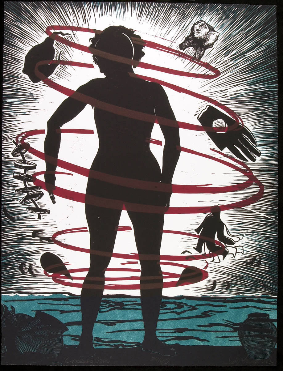 DescriptionA woman stands in silhouette in the center of the image. A red spiral engulfs her and various objects float about.Copyright© Judy Youngblood