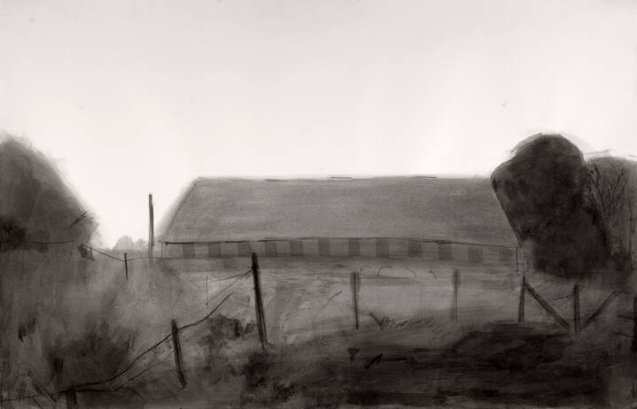 DescriptionHorizontal format ink wash painting in broad, dark strokes. Centrally-placed long barn with low, peaked roofline. Black tree form to right of building. Open sky expanse.Gallery LabelBroad swaths of watery, black ink define the low-slung barn set within a horizontal expanse of field, fence and trees in this resonant and poetic painting. The soft tonalities call to mind the mysterious quietude that separates day from night. Suzanne Chamlin, a former guest professor at the Kansas City Art Institute, paints en plein air (in the open air) in order to capture the unique quality of a day, a season, or a fleeting moment in time.