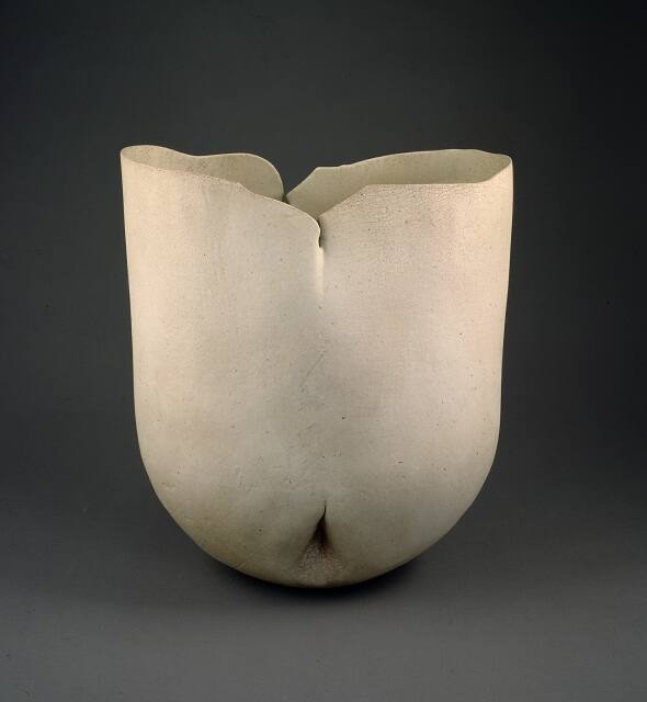 DescriptionThin-walled white/pink mottled sack-like form. splits in the center of the front and back. front, causing some waving in the wall of the form. thin split. oval indentation with brown glaze crackle inside.Gallery LabelThe strong, organic form of Pot R No. 401 subtly undulates only to be interrupted by an abrupt cleavage in the wafer-thin edge. Richard DeVore's seemingly free-form vessels result from carefully composed drawings that closely gauge geometric relationships and from constant editing of finished works. The creamy glaze that gradually deepens to a blush of rose is the result of slow accretions of glaze layers and many firings. DeVore imbued both the interior and exterior with a restrained yet powerful surface articulation and tension.