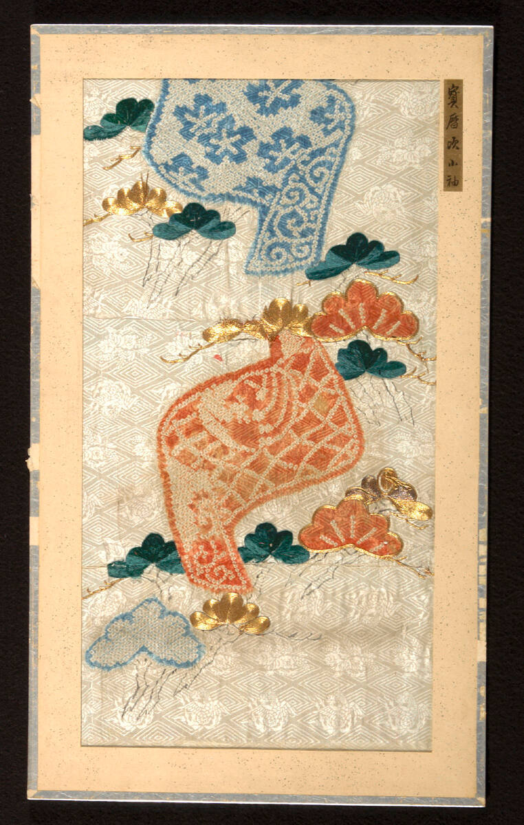 Fragment from uchikake for wealthy merchant woman with design of pine tree and bolt of silk cloth