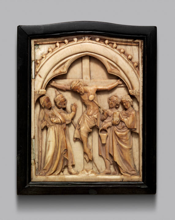 These three intricately carved ivory panels are the right halves of two-panel devotional objects, called diptychs. They depict the Crucifixion of Christ, a popular subject matter for ivory diptychs. In all three, the scene is set within a framework of Gothic architectural elements, including trefoil and pointed arches. Finely formed details in the ivory emphasize the figures' mournful expressions and ornately draped robes.