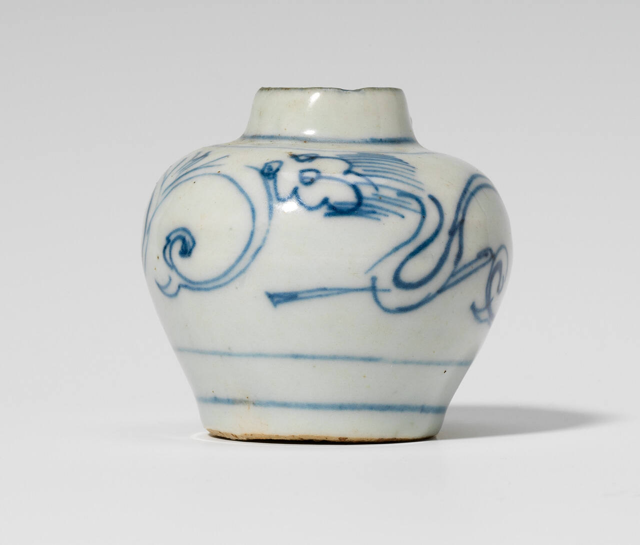 DescriptionOne of a pair of small, short-necked vases with blue and white dragon decoration.