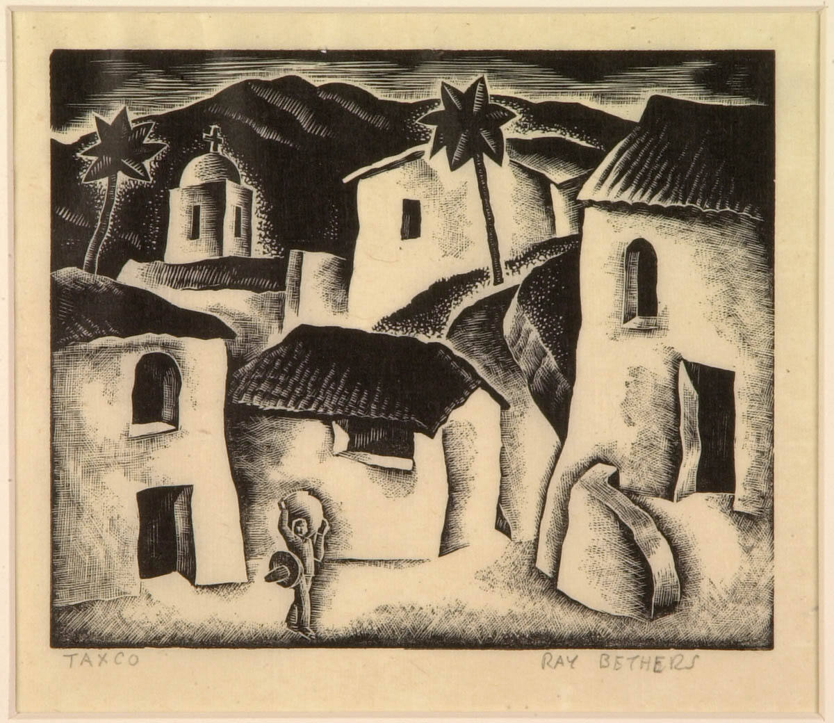 Gallery LabelRay Bethers traveled widely during the 1930s creating billboards aimed at potential tourists. However, he could also capture the spirit of a place in small scale works like this one. A trip in 1932 inspired this woodcut of Taxco de Alarcón, a former silver-mining center on the side of a mountain in southern Mexico. Using incredibly finely cut lines and delicate crosshatching, Bethers described the whitewashed adobe houses with tiled roofs that line the town’s steep, narrow alleys