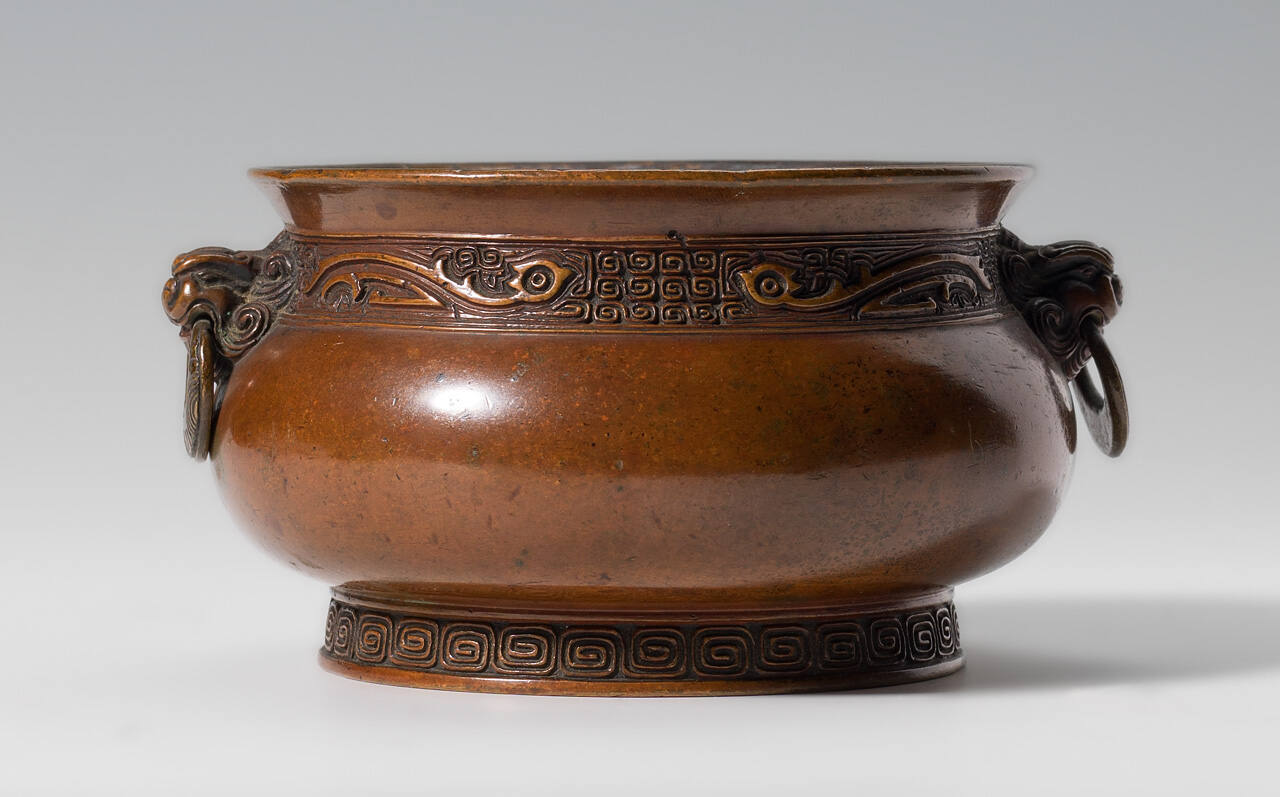 DescriptionRound bowl-shaped vessel with everted rim, ring foot, and two opposing animal-head handles with loose mouth rings. The neck and foot are decorated by bands of relief scrolls in recessed bands, the necks with symmetrical stylized forms. The outside patina is reddish-gold while the inside is black from burning materials.