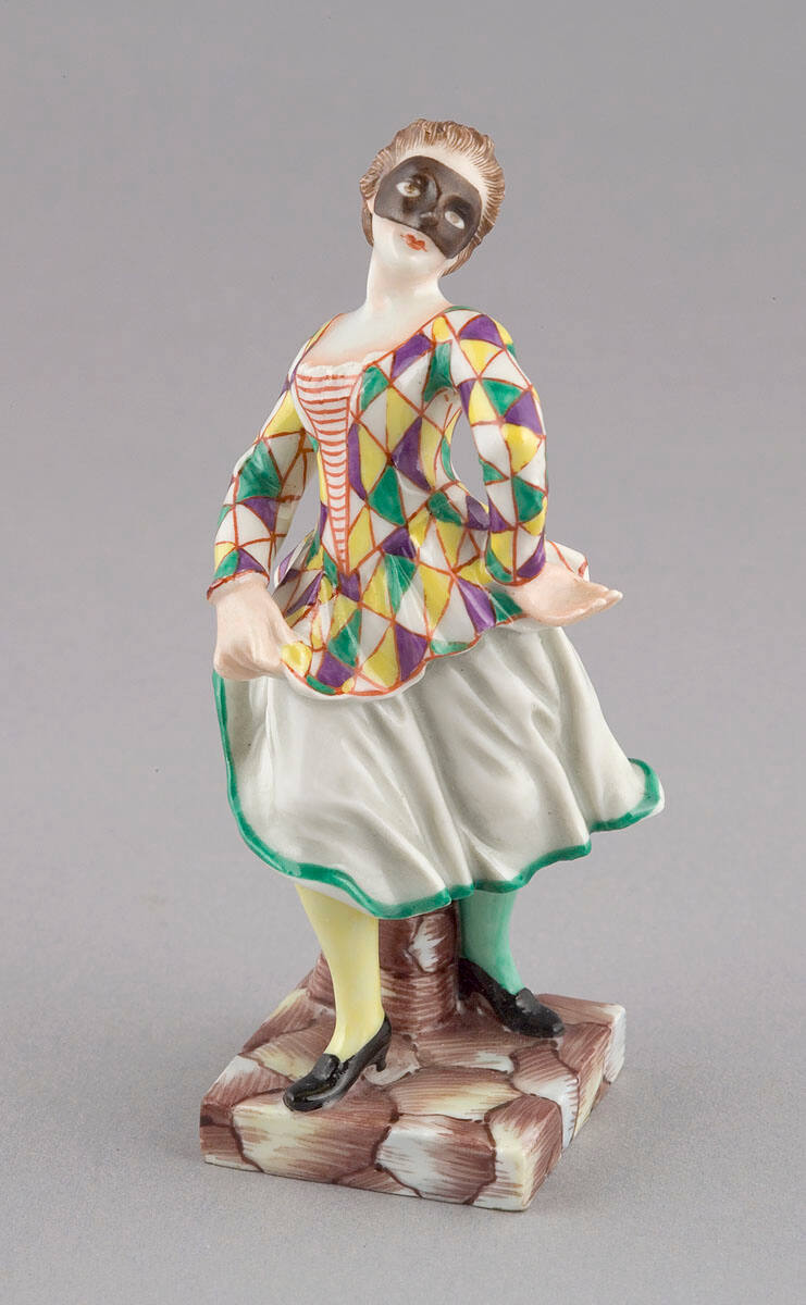 DescriptionFemale figure in dancing pose, head titled to left, left hand at hip, right holds edge of multi-colored patchwork bodice; full white skirt trimmed in green, stockings - on yellow, other green, black shoes, eye mask black; bottom: crown with letter N below it, in blue.