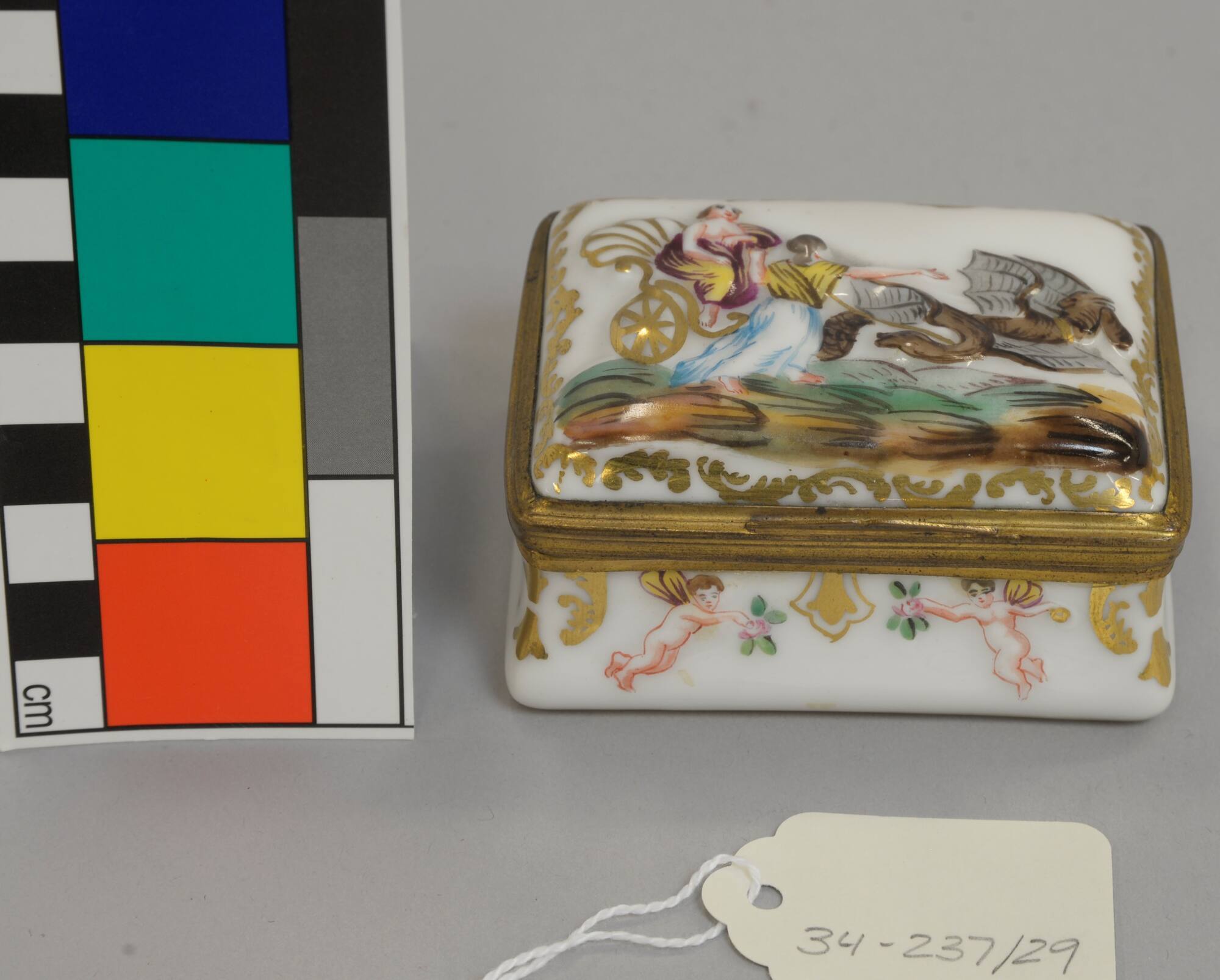 DescriptionSmall rectangular white enamel box with designs in colors on top of boy riding in chariot drawn by dragon and atteneded by a woman. Cupids on side of box. Hinged top.ProvenanceElla Anna Loose (née Clark, 1860-1945), Kansas City, MO, and Washington, DC, by 1934 [1];