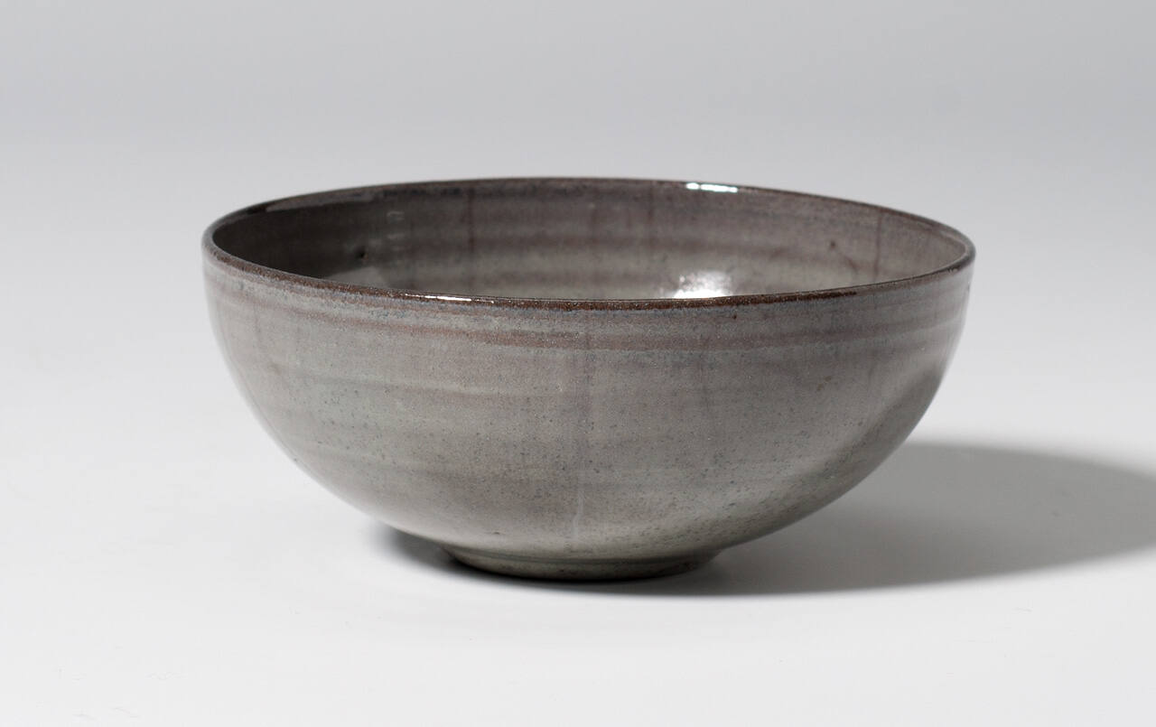 DescriptionBowl has smooth, shiny light grey glaze. Dark at the top. Dark pitch of glaze in the inside center, four lighter grey lines extend down to center from upper edge, visually dividing bowl into quarters. Horizontal concentric circle manipulation of the clay visible at the top.Copyright© Gail Reynolds Natzler, Trustee of the Natzler Trust