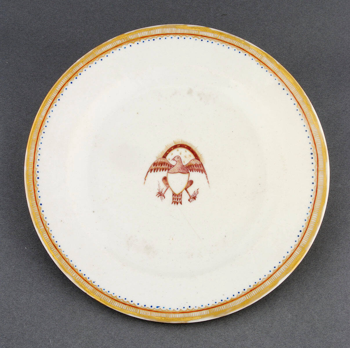 DescriptionPlate with American eagle, gold, salmon and blue dotted borders.