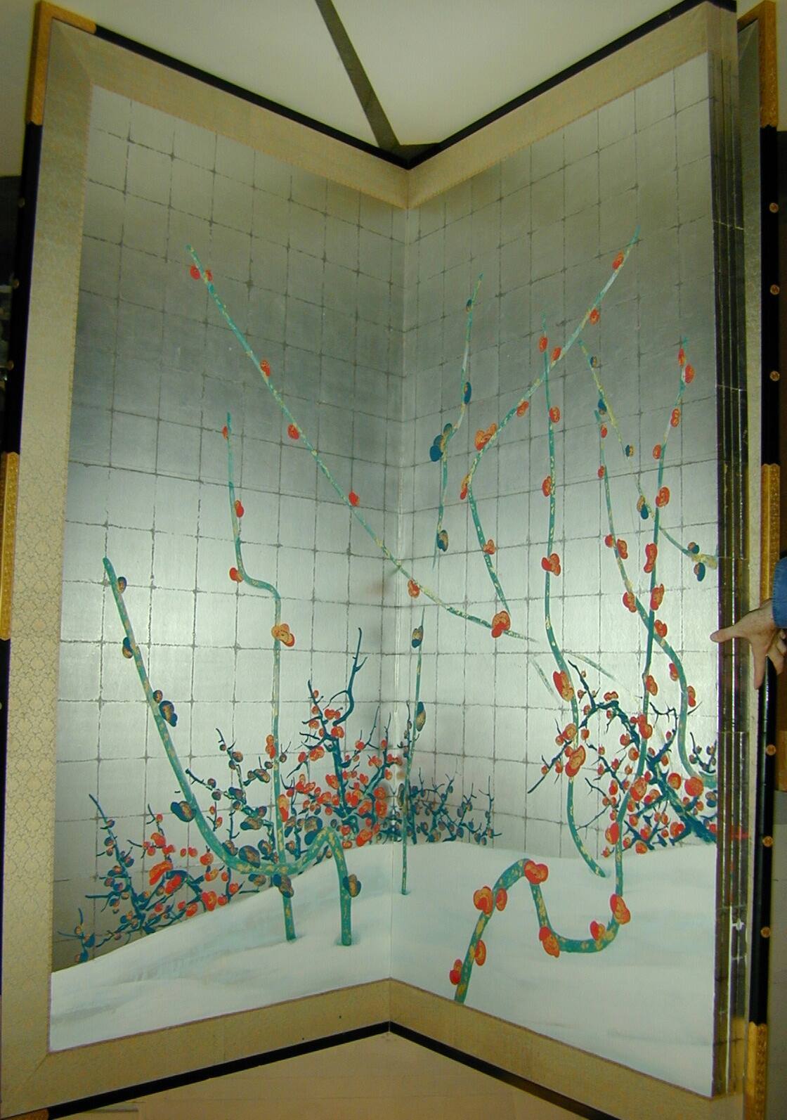 MediumSix-panel screen; painted in acrylic on silver foil (orientation: right in pair)