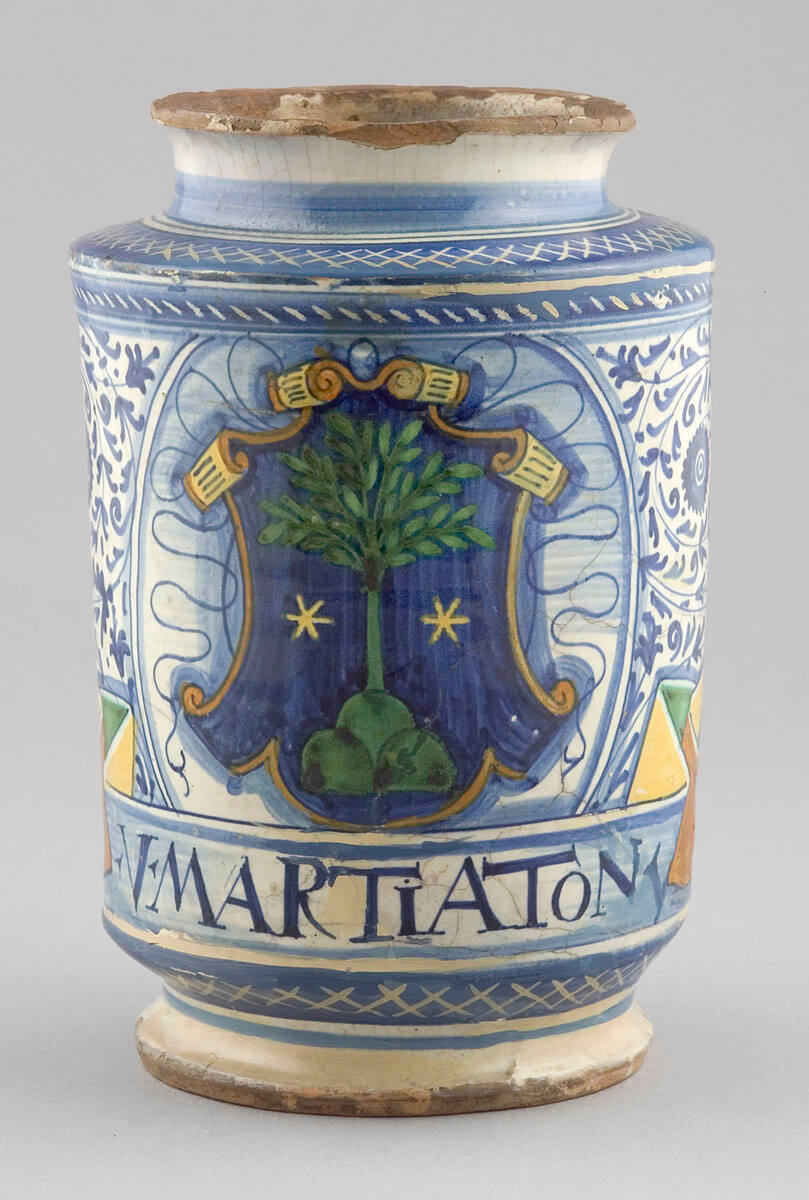 DescriptionFaenza jar; cream ground with blue decoration and coat-of-arms.ProvenanceAchille de Clemente (1874-1940), Florence, by January 15, 1931;