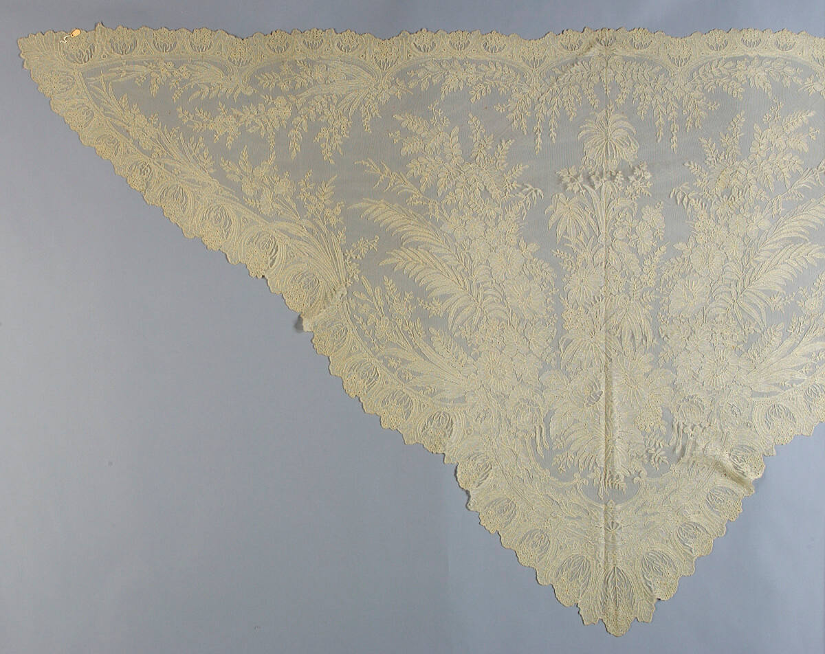 DescriptionTriangular shaped shawl with floral and leaf desings, ivory colored, with scalloped edge.
