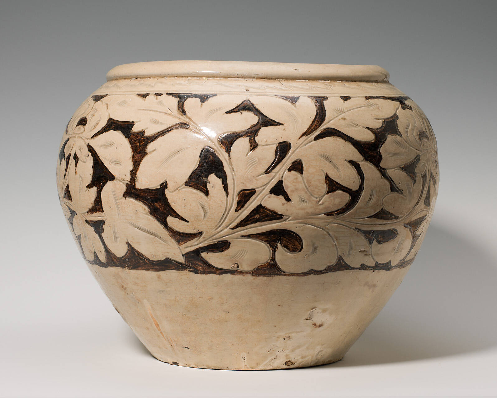 DescriptionA large bowl with an ovoid body, with a thick beveled mouth rim and the body tapering to a flat base. The white slip is cut away in a wide band of flowers and leaves, with the background painted brown and with a narrow band of wavy lines incised just below the rim. The whole is covered with a clear glaze.