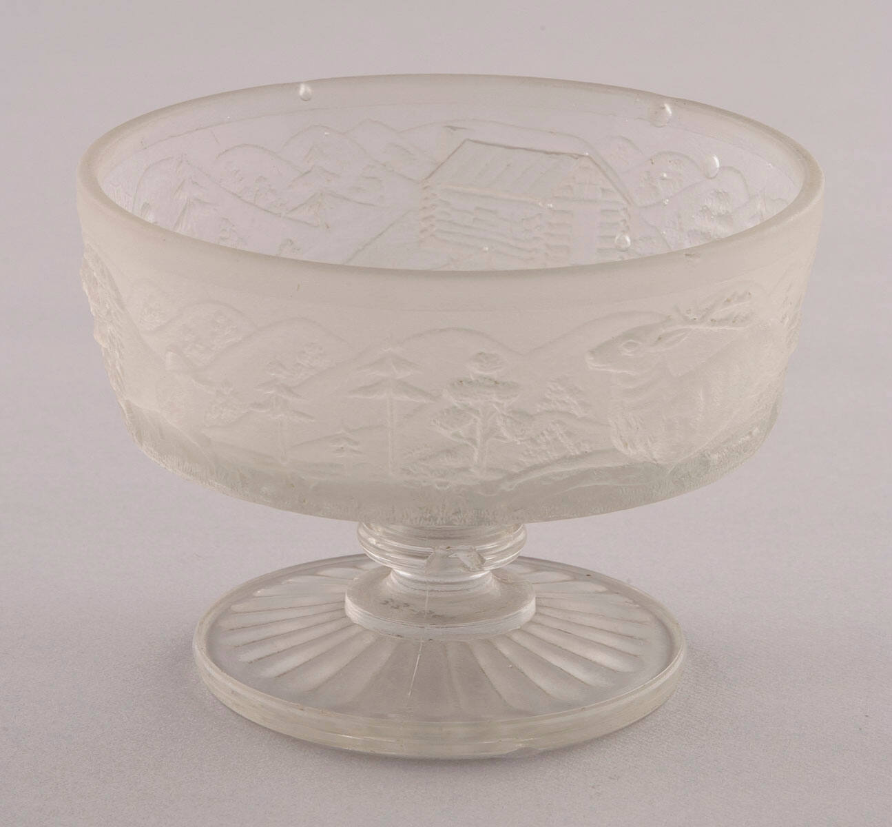 DescriptionDecorated with a pressed design of log cabin, buffalo and reindeer against Rocky Mountain background.