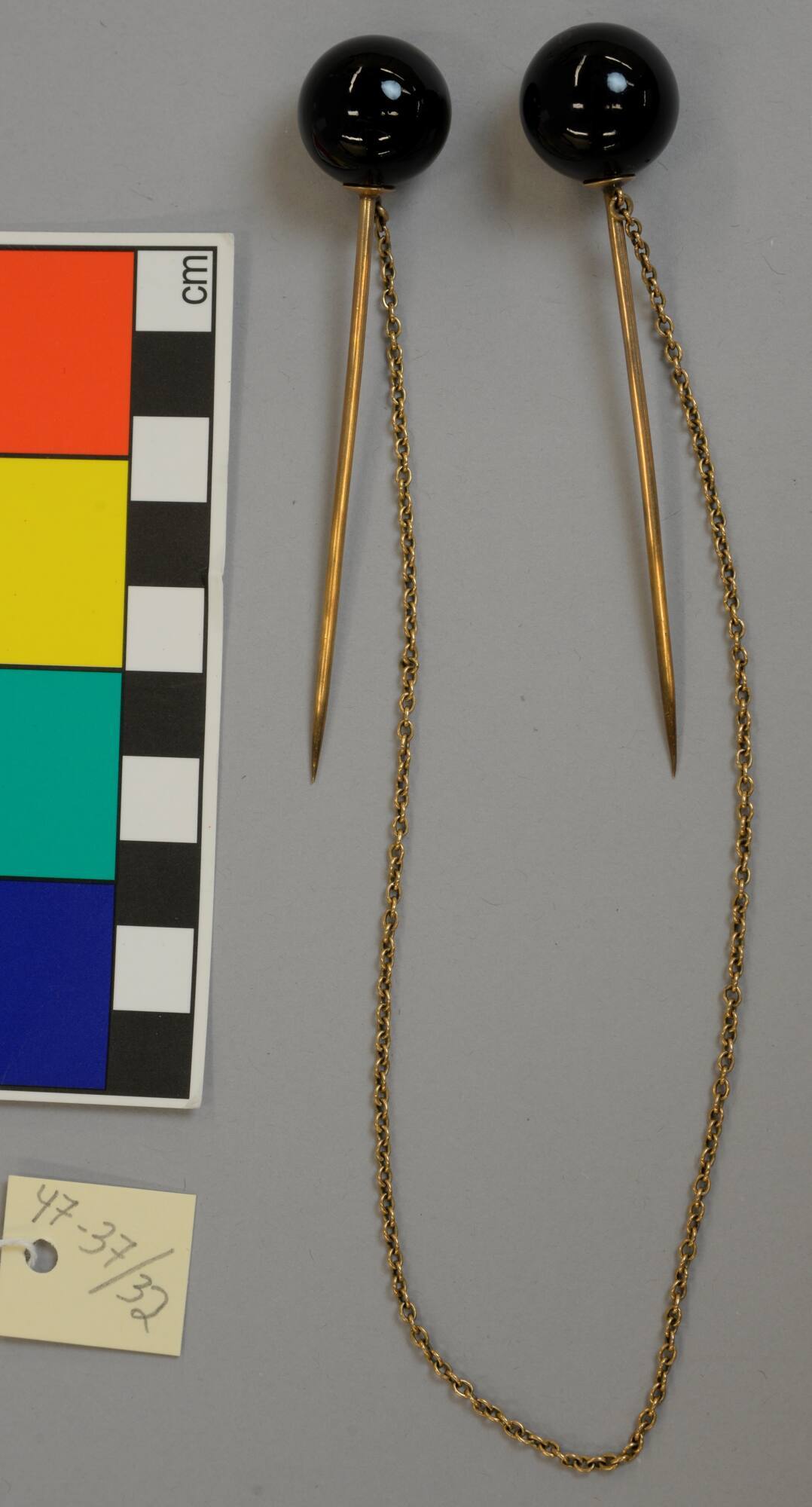DescriptionTwo black onyx ball head pins, fastened together by gold chain. Used for camel's hair shawl.