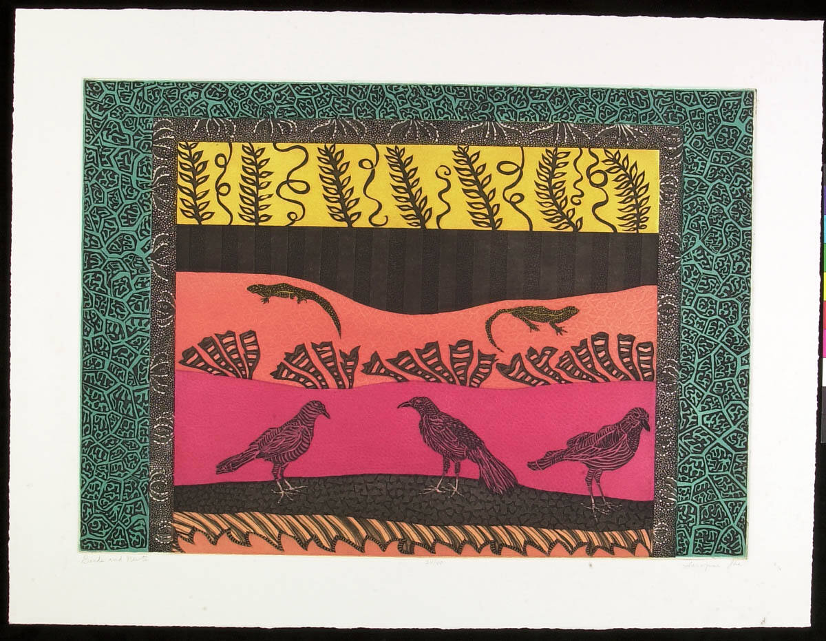 DescriptionCentral image of five bands placed against an aqua-colored and black, three-sided border. In the central image are birds, newts, and vegetation.Copyright© Sarojini Jha Johnson