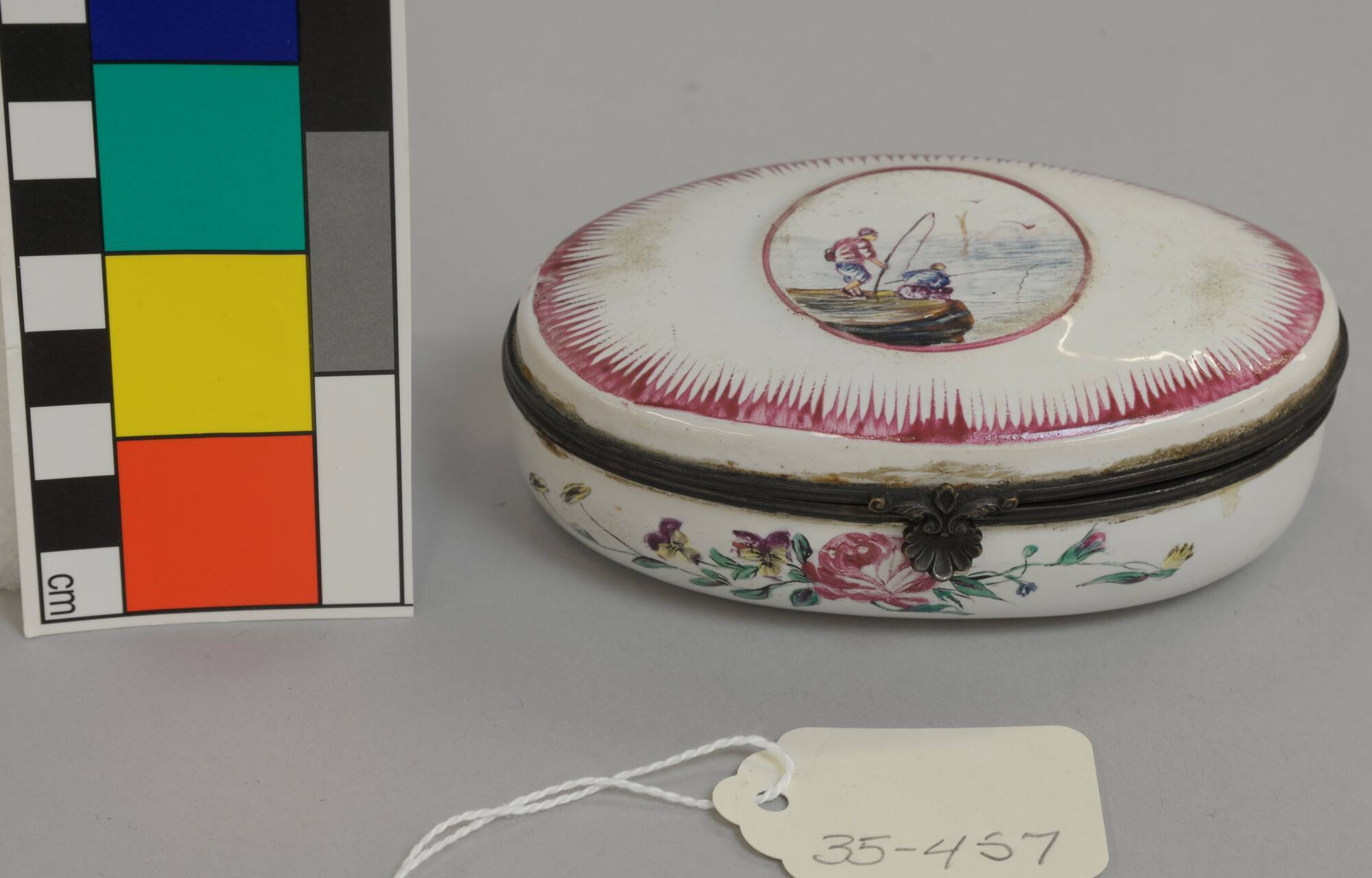 DescriptionOval white porcelain box with hinged lid and brass mount. Decorated on the top with a circular enameled picture of two men fishing and on the sides with enameled flowers.ProvenanceMargaret Cameron Chapman (née Mann, 1865-1935), Kansas City, MO, by 1935;