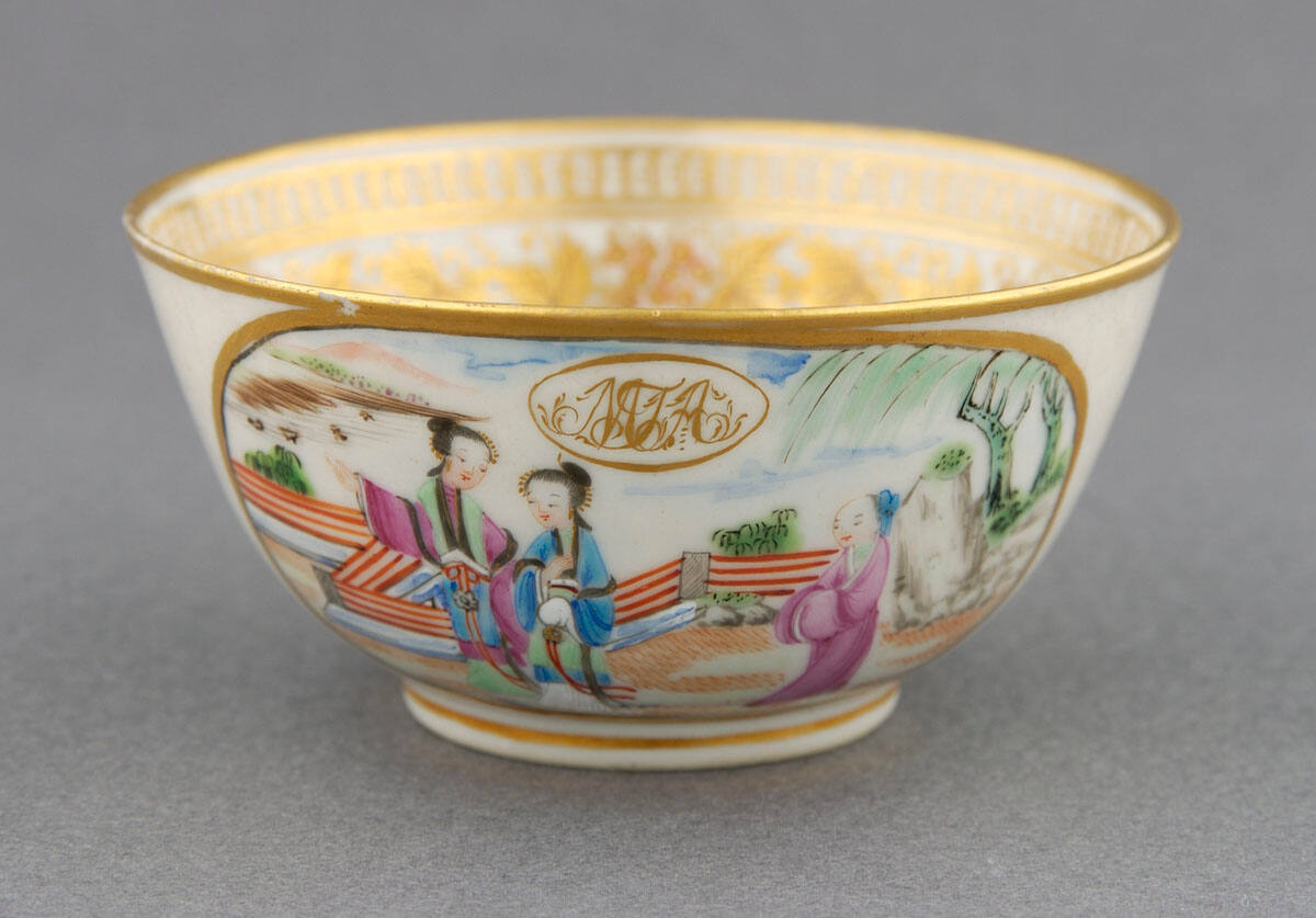 DescriptionPart of 77 piece tea service. In bottom of saucer, on exterior sides of cups is a scene painted in famille-rose style stowing 2 Chinese ladies and attendant in garden. Above figures is gold monogram, MTA (?) in gold oval. On interior sides of all pieces is border design in gold of grape bunches and leaves. On handleless cup on exterior side is also a gold spray of leaves and berries.