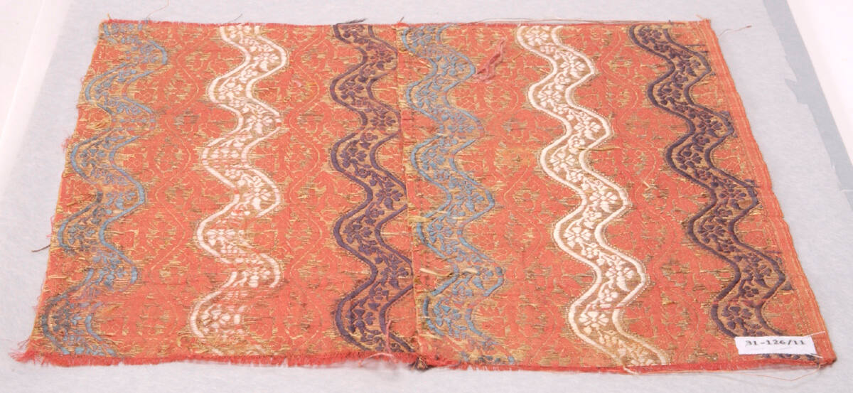 MediumPlain weave, brocaded, silk warp, discontinuous silk, and foil-wrapped silk weft