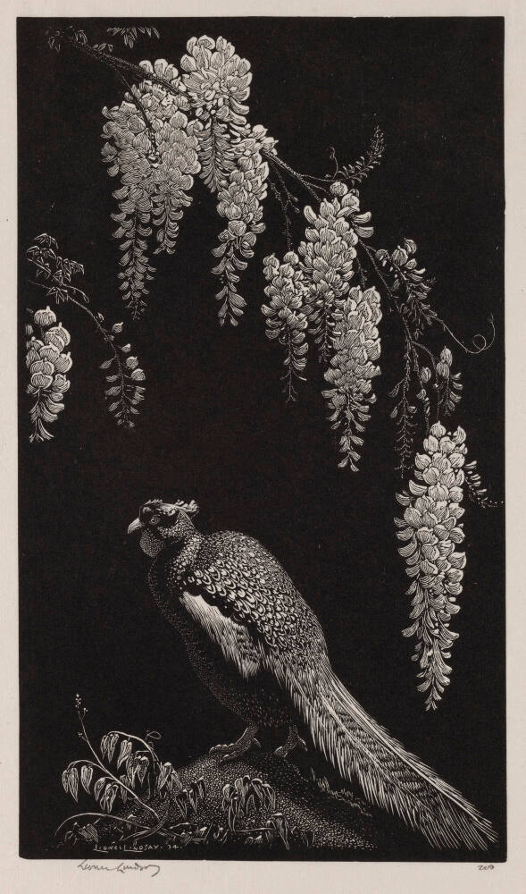 DescriptionPheasant stands under large branch of sloping wisteria.Copyright© Lionel Lindsay Estate