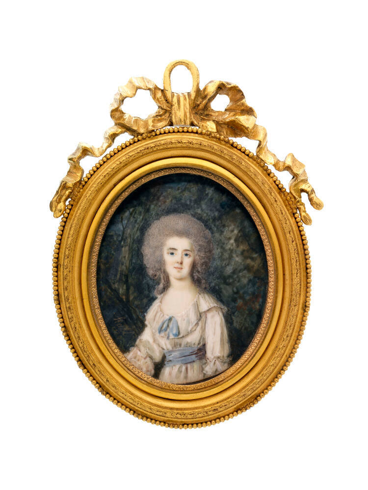 DescriptionPortrait miniature of a woman with powdered hair wearing a white gown before a landscape background.Exhibition History