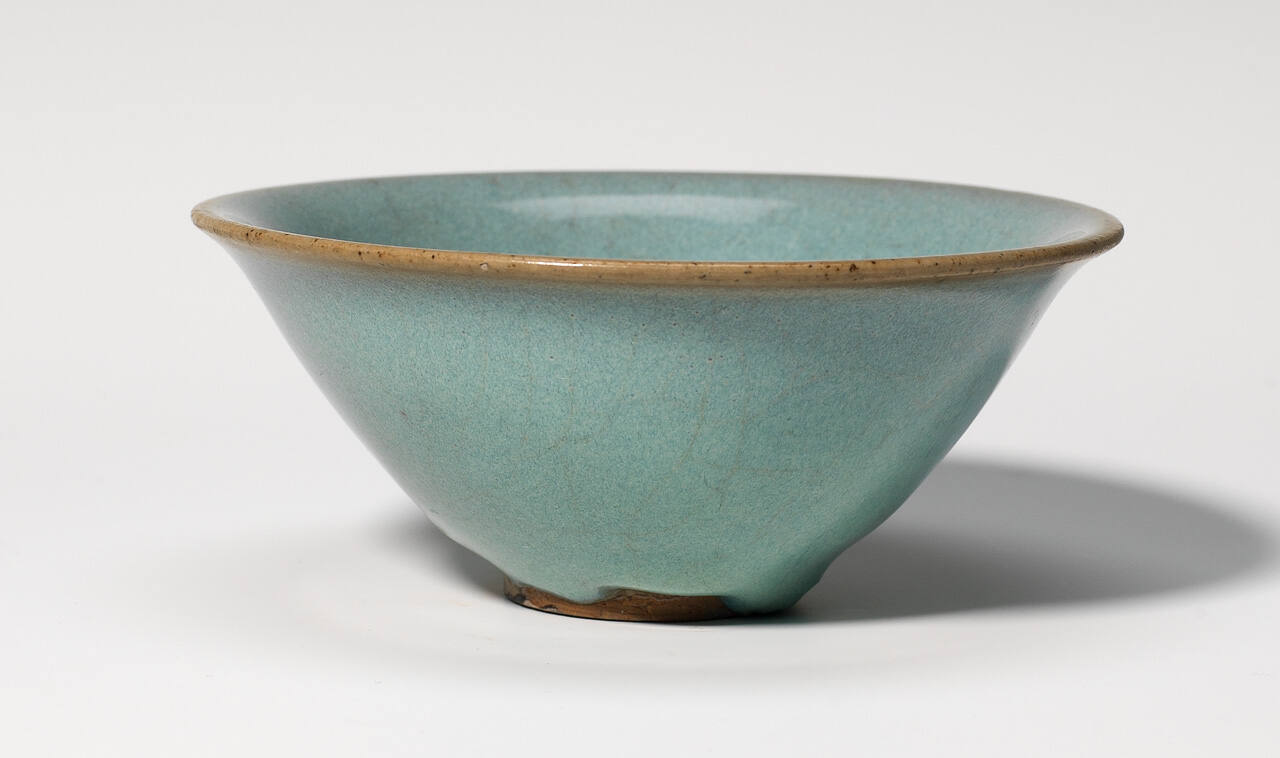 DescriptionLight-blue glaze with pitting and crazing. uneven at base with unglazed foot rim. Brown body.