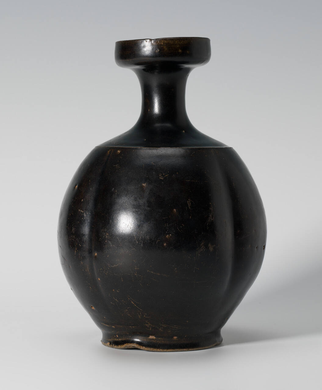 DescriptionVase with round, melon shaped (four lobed) body; tapers to a slender short neck, wide vertical lip at the top.